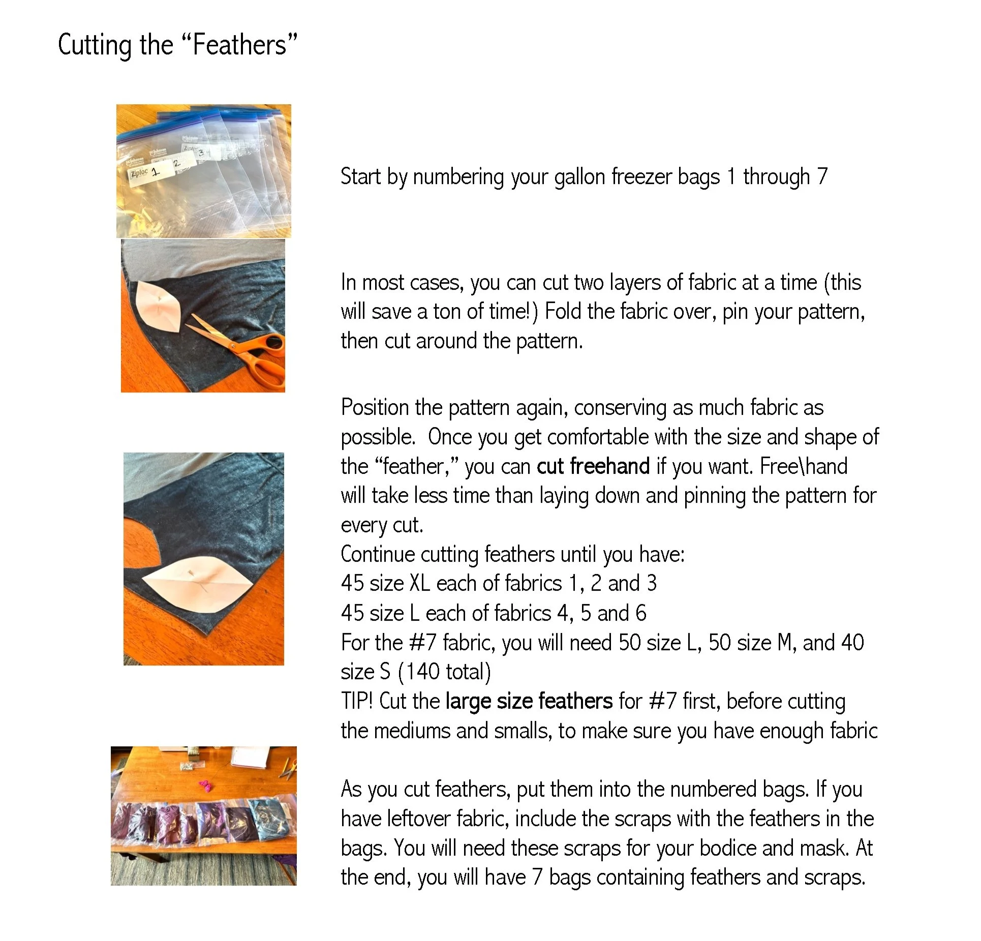 Copies of the feather patterns are available at the Procession Art Studio (at the Armory Creative Campus). The instructions below assume that you have your pattern already. Fabrics are numbered from the bottom up - #7 is the fabric that will make up the feathers on the TOP of your wings.